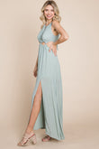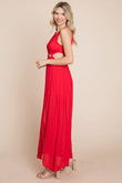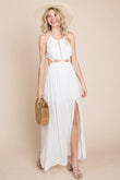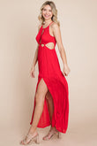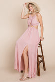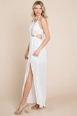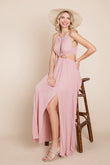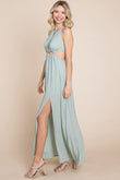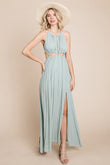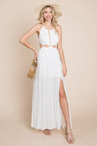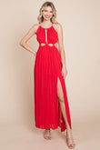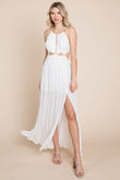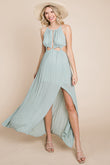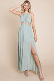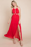 Features: Split Front, Cut out Front and Back, Front Self Lined, Partially Inner Lining, Waistband in the back, Maxi Length, Pleated, Adjustable Neck Tie Strap, Sleeveless